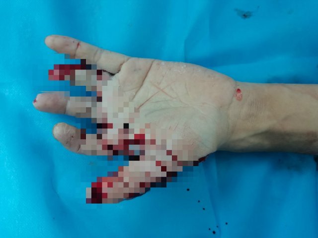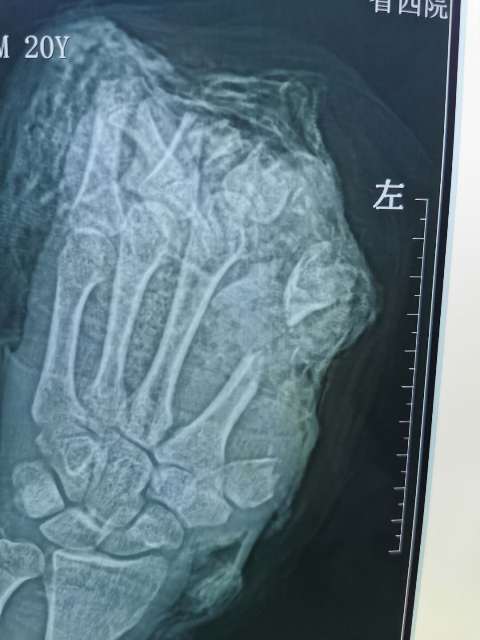 10月6日,20岁的小伙在工厂干活时左手不慎被切割机致左手拇指、示、中、环指完全离断;左小指开放伤伴肌腱神经血管离断;大鱼际皮肤软组织、环指中末节部分缺损、第一掌骨、第二掌骨部分缺损,鲜血直流。被工友慕名紧急送往日韩无码