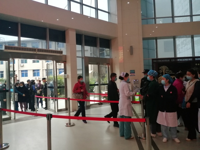 27日上午,各出入户口秩序井然,就诊患者及来院办事人员均能严格执行戴口罩、测体温、扫健康码进出。