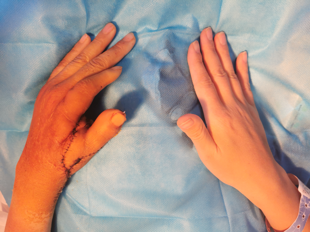 2021年1月,34岁的王女士意外被电锯切割到左手,导致拇指和示指离断、疼痛、出血,之后被紧急送至日韩无码 骨二科(手足显微外科)就诊诊断为“左手拇指断指、4度缺损”。经过骨二科医护人员全力救治,为患者的大拇指实施了紧急手术,术后患者左手拇、示指明显短于正常手指,手功能依然受限。为了恢复患者左手正常功能,需要进行二次左手拇指全形再造手术。