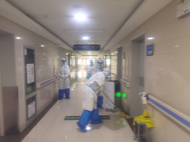 早上,病区护士从保障组工作人员接过早餐,逐一给每一位康复患者们分发早餐,口罩、消毒湿巾,垃圾袋等。量体温,患者们吃完饭后用发的消毒湿巾擦拭自己区域内接触频率高的接触面,提醒患者开窗通风30分钟。护士们采集物表核酸,用配置好的84液擦拭台面,灯开关,电话,门把手等,拖护士站,走廊及病房的地面,同时也用空气消毒机消毒各个病房,为康复患者提供健康温馨的环境。