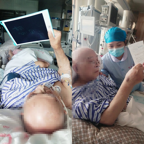 在重症医学科住院期间,黄老爷爷因语言障碍无法和医务人员进行有效沟通,老人总是“啊、啊”的多次呼喊,我们不明白老人的用意,猜测是不是哪里不舒服,得到的答案是爷爷的摇头。老人是位退休老教授,于是我们用写字板文字的形式进行沟通和交流,但因高龄、肢体不灵活等多种原因,写的字总是不清楚。对此,ICU医护人员采取专科治疗和专科护理的方案对老人进行语言交流及康复锻炼后,老人含含糊糊的说出“不来看我”,写出“想回家”,此刻大家终于明白了老爷爷对家人的思念......