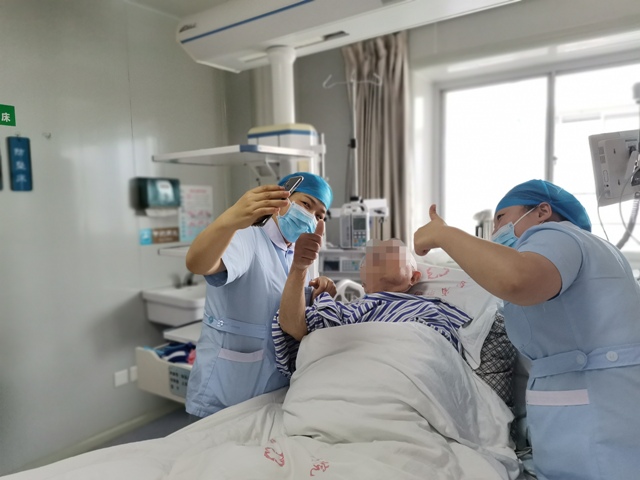 医院ICU护士曹转说,老爷爷入住ICU以来,因为疫情防控和科室管理的要求,家人无法探视,加之病痛折磨,他情绪一度异常低落。在我们科医生和护士的精心治疗和温情护理下,刚开始无法和老人沟通,后来采取了一系列有温情护理方式视频“疗”天、写字、家属拍摄视频给老人看后,他从一个不会表达变成了逐渐会和我们医护人员交流,也特别配合治疗。我们已与家属预约了下次视频“疗”天的时间。