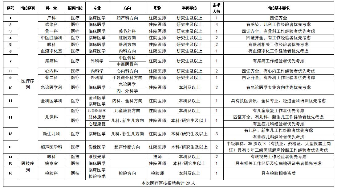 根据工作需要,本次面向社会招聘专业技术岗位29人,具体招聘岗位和要求详见附件:《2022年度医、技等专业技术岗位招聘计划表》。