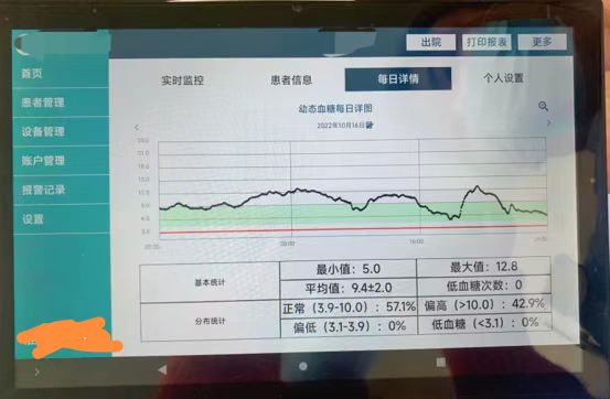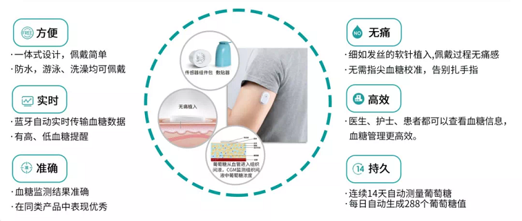 动态血糖监测仪技术(CGM)是一项微创血糖检测技术,是将动态血糖探头植入皮下,与动态血糖监测仪相连接,通过探头直接感应皮下组织间液的葡萄糖浓度来反映血糖水平。每5分钟监测一次血糖数据,最长可连续监测14天。相比传统指尖血糖仪具有大大减少患者测指尖血糖的次数,提高患者的舒适度、可以提供连续、全面、可靠的全天血糖信息,更具有发现夜间隐匿性低血糖、观察血糖变化趋势等优点。