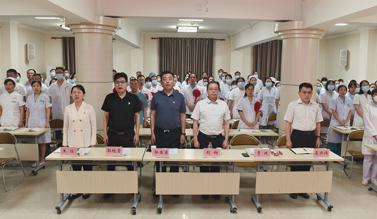 党委书记郭亚东代表院党委向全院共产党员和离退休老党员表示节日的问候!向受到表彰的优秀个人表示热烈的祝贺,致以崇高的敬意!向辛勤耕耘在医院各条战线的广大共产党员和党务工作者,特别是“光荣在党50年”的老同志表示亲切的慰间和衷心的感谢! 他要求,作为一名新时代的党员,我们要从思想上正本清源、固本培元,始终保持共产党人的政治本色;要有提振锐意进取、担当有为的精气神,逐步建立起医院发展的新格局。要不断提高为民服务的能力,结合主题教育的要求,各党支部要开展好主题党日实践活动。我们更要知敬畏守底线,用实际行动维护群众根本利益。以今天的大会为契机,不断从习近平新时代中国特色社会主义思想中汲取奋发进取的智慧和力量,奋力谱写医院高质量发展的新篇章。