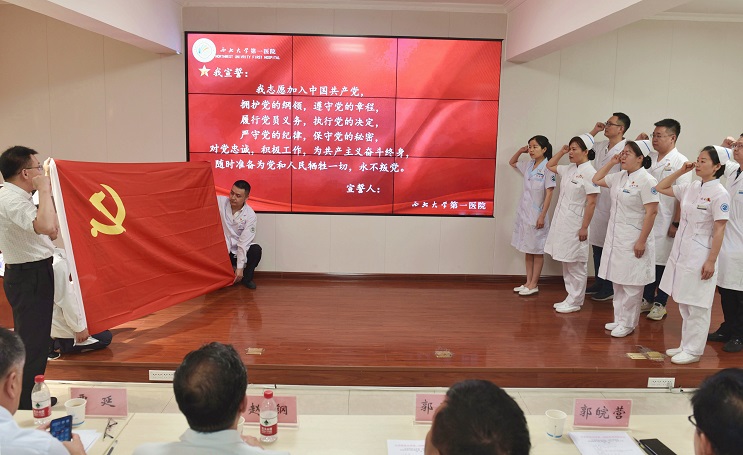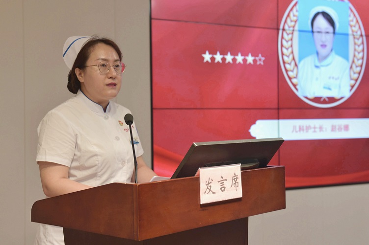 儿科护士长赵谷娜代表新党员发言,她表示要向老党员们学习,在教学、临床医疗、科学研究等方面坚持为人民服务,不断提高自身思想政治素质和业务技能,以饱满的工作热情、强烈的责任感和使命感,处处挑重担、时时做表率,为党旗增光添彩,为医院建设发展添砖加瓦。