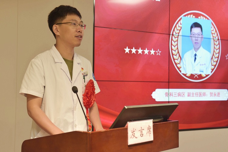 优秀党员代表,骨科三病区副主任医师贺永进分享了以党建与业务深度融合主动担当作为,去年年底随着国家对疫情防控政策的调控医院迅速成立新冠重症病区,他作为一名青年党员,积极响应院党委的号召,放下手术刀,拿起呼吸机,加入了新冠重症病区的队伍,经过40余天的奋战,战胜了新冠疫情,圆满完成了任务。