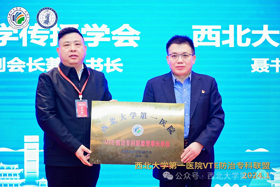 陕西省医学传播学会常务副会长兼秘书长王维君为理事长单位授牌,日韩无码 副院长聂书伟为理事长单位接牌