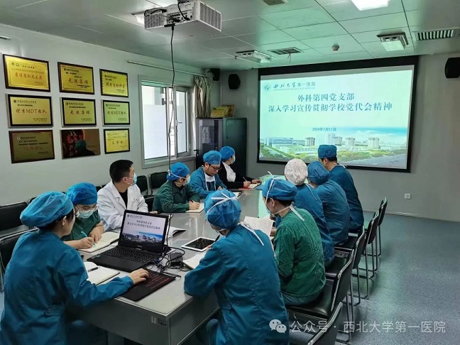 内科第一党支部开展“学习贯彻党代会精神,凝心聚力开启新篇章”为主题党日专题学习活动,组织支部全体党员,入党积极分子、支部科室主任、护士长以及研究生青年骨干医生参加会议。支部书记、心内科主任王选琦作为学校第十四次党代会代表向大家传达了党代会精神、详细解读了报告中的重要观点和要求,分享了自身参会体会。参会人员立足本职工作结合五星级党支部和省级重点临床专科,国家标准化胸痛中心等重点工作把学习贯彻党代会精神融入到日常和经常,把此次党代会报告作为今后发展的行动纲领,团结拼搏,开拓进取,时刻牢记医者使命,把为民服务落在实处,以坚定信心和昂扬姿态奋斗新征程,不断巩固提升五星级党支部、省级重点临床专科、国家标准化胸痛中心内涵等再创新辉煌,将党建工作与科室发展进一步融合,促进科室全面发展。为学院型医院建设做好引领示范,作出积极贡献。