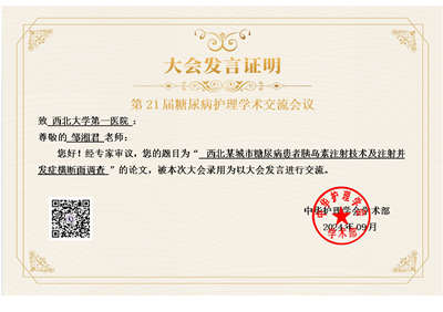 院护理部副主任邹湘君论文《西北某城市糖尿病患者胰岛素注射技术及注射并发症横断面调查》,经过全国投稿论文的海量选拔,脱颖而出,受大会邀请进行现场发言。