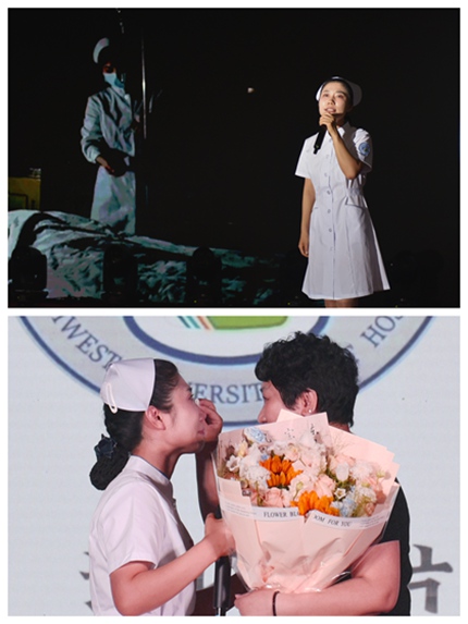 独唱《这世界那么多人》以歌传情,情景剧《如愿》以剧述爱,护理的长廊跨越时空,相遇和守护温暖着生命,年华无声弹指过,未应磨染是初心。