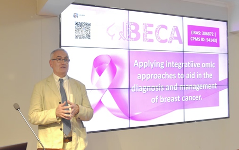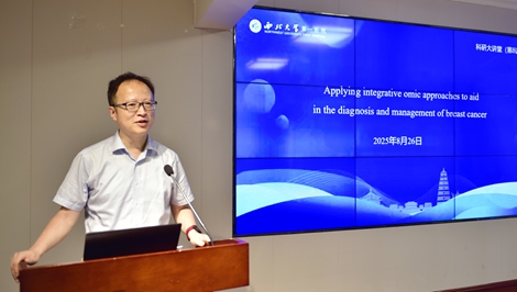 讲座中,他聚焦乳腺癌的早期诊断、病情分层与个体化治疗策略,系统阐释了基因组学、转录组学等多维度组学技术如何协同作用,突破传统诊疗局限,为临床实践提供“精准化、个性化”的新路径,助力乳腺癌诊疗体系持续升级。Mur教授还分享了其团队在肿瘤发生机制、靶向药物研发及免疫治疗等方面的最新科研进展。他从英国乳腺癌三重评估体系(涵盖临床检查、影像评估与病理活检)切入,深入解析乳腺癌分型、现有筛查策略的局限性及代谢组学差异研究。Mur教授以深入浅出的方式,层层剖析研究设计中的创新思维,并展示多项重要成果,为与会者带来一场融学术深度与前沿视野于一体的精彩报告。